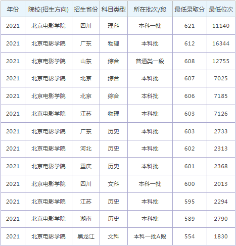 想要報(bào)考北京電影學(xué)院的同學(xué),都比較關(guān)注北京電影學(xué)院2022年的錄取分?jǐn)?shù)線,那么,高考多少分可以上北京電影學(xué)院呢?北京電影學(xué)院歷年最低錄取分?jǐn)?shù)線是多少?下面為大家整理了北京電影學(xué)院錄取分?jǐn)?shù)線2022是多少分(含2021-2022歷年),希望對(duì)大家有所幫助,僅供參考。![]() 北京電影學(xué)院錄取分?jǐn)?shù)線2022是多少分? 截止到目前,北京電影學(xué)院2022年錄取分?jǐn)?shù)線還未公布,如果需要2022年北京電影學(xué)院分?jǐn)?shù)線的同學(xué),不妨參考2021年北京電影學(xué)院錄取分?jǐn)?shù)線和北京電影學(xué)院歷年錄取分?jǐn)?shù)線,希望對(duì)大家有所幫助,如有不同,請(qǐng)以北京電影學(xué)院官網(wǎng)最新公布的信息為準(zhǔn)。 2021北京電影學(xué)院錄取分?jǐn)?shù)線 ![]() ![]() 北京電影學(xué)院是幾本? 北京電影學(xué)院在北京是本科一批招生,我們通常認(rèn)為北京電影學(xué)院是一本大學(xué)。 ![]() 北京電影學(xué)院簡(jiǎn)介 北京電影學(xué)院(Beijing Film Academy),是北京市人民政府、國(guó)家新聞出版廣電總局和中華人民共和國(guó)教育部共建的藝術(shù)高校,中國(guó)政府獎(jiǎng)學(xué)金來(lái)華留學(xué)生接收院校,國(guó)際電影電視高等院校聯(lián)合會(huì)(CILECT)理事學(xué)校和亞太地區(qū)電影年會(huì)執(zhí)行主席,首家主持國(guó)家“863”項(xiàng)目的藝術(shù)院校,教育部本科教學(xué)工作水平評(píng)估優(yōu)秀學(xué)校,北京市留學(xué)生教學(xué)管理先進(jìn)單位,2018中國(guó)科幻大會(huì)優(yōu)秀組織單位,是國(guó)家動(dòng)畫教育研究基地、北京影視藝術(shù)研究基地和中國(guó)兒童電影研究中心的掛牌單位。 北京電影學(xué)院的前身是1950年創(chuàng)建的中央電影局表演藝術(shù)研究所。該所1951年更名為中央文化部電影局電影學(xué)校,1953年更名為北京電影學(xué)校,1956年改制為北京電影學(xué)院。 通過(guò)對(duì)北京電影學(xué)院錄取分?jǐn)?shù)線的了解,大家大概知道了高考多少分可以上北京電影學(xué)院,以上數(shù)據(jù)源于網(wǎng)絡(luò),僅供參考,大家如果想要了解其他大學(xué)錄取分?jǐn)?shù)線、大學(xué)簡(jiǎn)介、大學(xué)排行榜、專業(yè)選擇等內(nèi)容,請(qǐng)點(diǎn)擊訪問(wèn):大學(xué)欄目。 推薦閱讀: 西安交通大學(xué)錄取分?jǐn)?shù)線 浙江大學(xué)錄取分?jǐn)?shù)線 中國(guó)農(nóng)業(yè)大學(xué)錄取分?jǐn)?shù)線 哈爾濱工業(yè)大學(xué)錄取分?jǐn)?shù)線 北京師范大學(xué)錄取分?jǐn)?shù)線 中央民族大學(xué)錄取分?jǐn)?shù)線 |