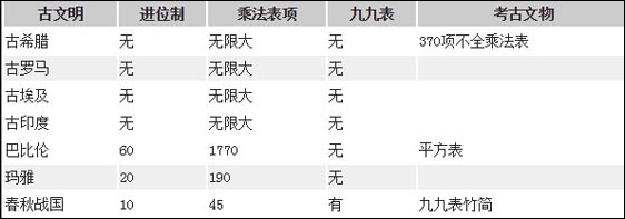 這個(gè)時(shí)候發(fā)現(xiàn)九九乘法表的厲害了吧? 乘法口訣是中國古代籌算中的基本計(jì)算規(guī)則,春秋戰(zhàn)國時(shí)代發(fā)明了九九表。后來東傳入高麗、日本,經(jīng)過絲綢之路西傳印度、波斯,繼而流行全世界。 西方文明古國希臘和巴比倫,也有發(fā)明乘法表,不過復(fù)雜些。巴比倫發(fā)明的希臘乘法表有一千七百多項(xiàng),而且不夠完全。表格這么長,算數(shù)當(dāng)然辛苦了,所以在13世紀(jì)之前,一個(gè)能夠除大數(shù)的人,就會(huì)被視為數(shù)學(xué)家。
