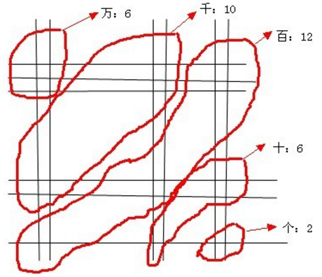 最后從右下角開始數(shù)點(diǎn)點(diǎn),交叉點(diǎn)從右下角到左下角,單位依次是個(gè)、十、百、千、萬。