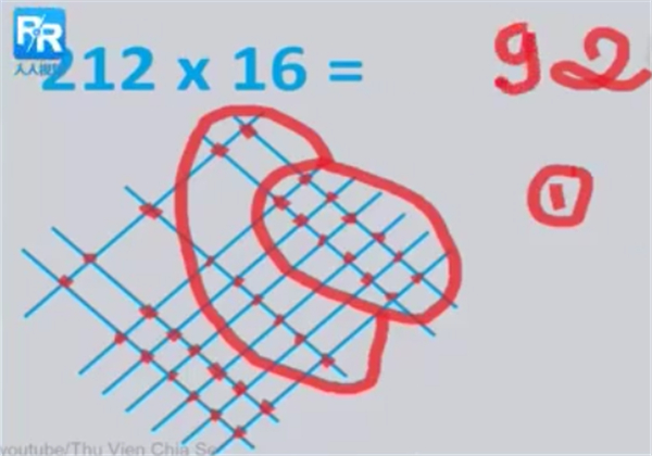 再比如212X16,先分別畫2條、1條、2條豎線代表“212”;再分別畫1條、6條橫線代表“16”,然后把交叉點(diǎn)找出來。