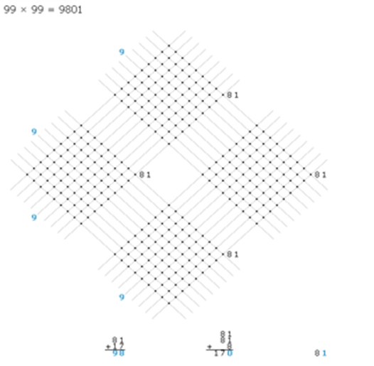 其實(shí),這種方法被稱為“畫線乘法”,乍一看很牛X:只需要數(shù)點(diǎn)點(diǎn)就好,再也不用死記硬背乘法口訣了呢! 但是,一旦相乘的數(shù)字變大,工作量就會(huì)很大。 比如,這是99X99: