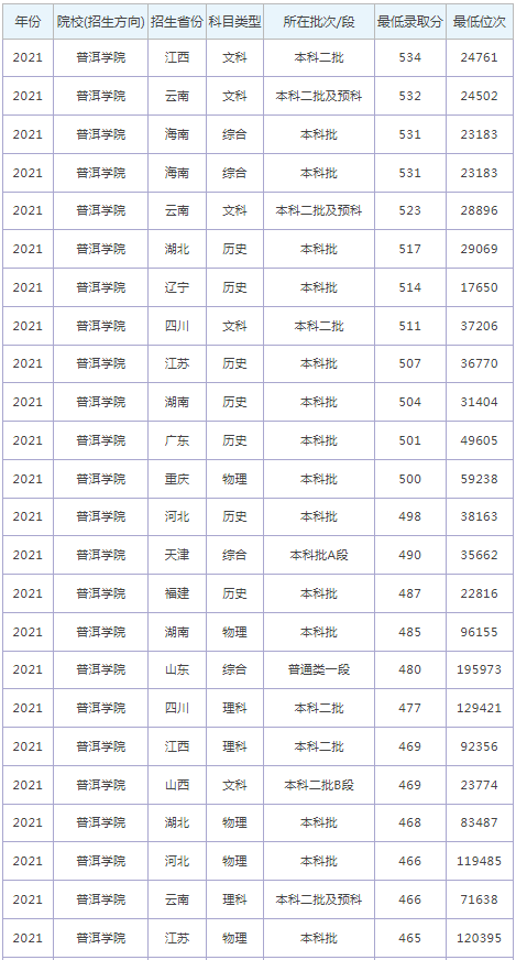 想要報(bào)考普洱學(xué)院的同學(xué),都比較關(guān)注普洱學(xué)院今年的錄取分?jǐn)?shù)線,那么,高考多少分可以上普洱學(xué)院呢?普洱學(xué)院歷年最低錄取分?jǐn)?shù)線是多少?下面為大家整理了普洱學(xué)院錄取分?jǐn)?shù)線,希望對(duì)大家有所幫助,僅供參考。![]() 2021普洱學(xué)院錄取分?jǐn)?shù)線 ![]() ![]() 普洱學(xué)院是公辦還是民辦大學(xué)? 根據(jù)全國高等學(xué)校信息可知,普洱學(xué)院是公辦大學(xué)。通常來說,公辦大學(xué)學(xué)費(fèi)便宜,民辦大學(xué)學(xué)費(fèi)較貴。 ![]() 普洱學(xué)院簡介 普洱學(xué)院(Pu——er University)坐落在滇西南重鎮(zhèn)普洱,是云南省屬普通本科高等學(xué)校,由云南省人民政府舉辦,實(shí)行省市共管共建,以省為主的管理體制,是國家首批卓越農(nóng)林人才教育培養(yǎng)計(jì)劃改革試點(diǎn)高校。 普洱學(xué)院的前身是思茅師范高等專科學(xué)校,于1977年開始籌建,1978年10月正式招生。1998年4月,云南省電大思茅分校成建制并入,同年9月,學(xué)校的管理體制調(diào)整為“省地共建共管,以省為主”。2012年3月29日經(jīng)教育部同意在思茅師范高等??茖W(xué)校的基礎(chǔ)上建立普洱學(xué)院。 通過對(duì)普洱學(xué)院錄取分?jǐn)?shù)線的了解,大家大概知道了高考多少分可以上普洱學(xué)院,以上數(shù)據(jù)源于網(wǎng)絡(luò),僅供參考,大家如果想要了解其他大學(xué)錄取分?jǐn)?shù)線、大學(xué)簡介、大學(xué)排行榜、專業(yè)選擇等內(nèi)容,請點(diǎn)擊訪問:大學(xué)欄目。 推薦閱讀: 新疆大學(xué)錄取分?jǐn)?shù)線 西藏大學(xué)錄取分?jǐn)?shù)線 喀什大學(xué)錄取分?jǐn)?shù)線 石河子大學(xué)錄取分?jǐn)?shù)線 蘭州大學(xué)錄取分?jǐn)?shù)線 高考多少分可以上寧夏大學(xué)? 西北師范大學(xué)錄取分?jǐn)?shù)線 |