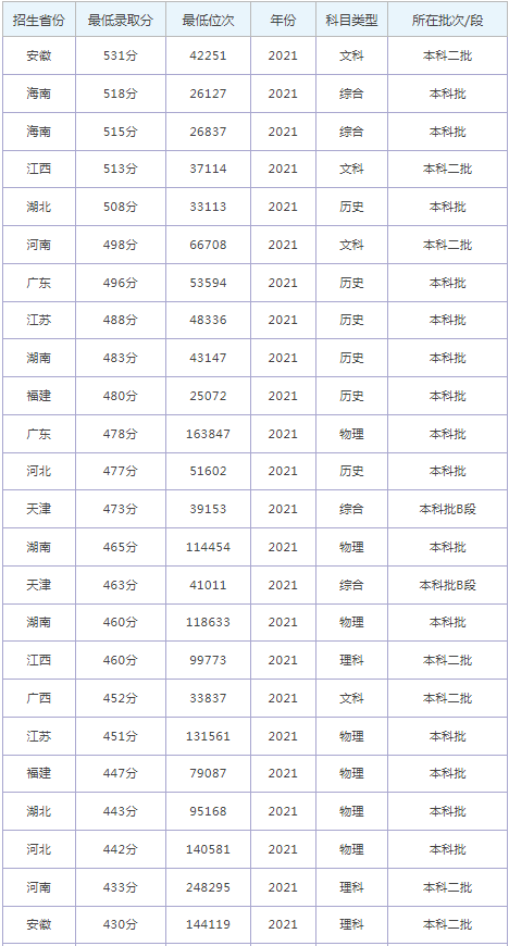 想要報考湘潭理工學院的同學,都比較關注湘潭理工學院2022年的錄取分數(shù)線,那么,高考多少分可以上湘潭理工學院呢?湘潭理工學院歷年最低錄取分數(shù)線是多少?下面為大家整理了湘潭理工學院錄取分數(shù)線2022是多少分(含2021-2022歷年),希望對大家有所幫助,僅供參考。![]() 湘潭理工學院錄取分數(shù)線2022是多少分? 截止到目前,湘潭理工學院2022年錄取分數(shù)線還未公布,如果需要2022年湘潭理工學院分數(shù)線的同學,不妨參考2021年湘潭理工學院錄取分數(shù)線和湘潭理工學院歷年錄取分數(shù)線,希望對大家有所幫助,如有不同,請以湘潭理工學院官網最新公布的信息為準。 2021湘潭理工學院錄取分數(shù)線 ![]() ![]() 湘潭理工學院是公辦還是民辦大學? 根據(jù)全國高等學校信息可知,湘潭理工學院是民辦大學。通常來說,公辦大學社會認可度高,各專業(yè)學費較便宜,民辦大學各專業(yè)收費較貴。 ![]() 湘潭理工學院簡介 湘潭理工學院(Xiangtan Institute of Technology)位于湖南省湘潭市九華經開區(qū),長株潭大河西科創(chuàng)走廊的中心結點,是經教育部批準的湖南省第一所完成獨立學院轉設的普通本科高校,是人社部吉利博士后科研工作站聯(lián)合培養(yǎng)單位。 湘潭理工學院前身為成立于2001年的湖南工商大學北津學院。建校之初,學院位于美麗的湘江河畔、長沙西漢時諸侯的歷史古城——北津城內。2018年,在湖南省委省政府的關心和支持下,按照教育部相關規(guī)定,湖南工商大學和吉利集團合作舉辦湖南工商大學北津學院。2019年,北津學院湘潭校區(qū)建成,并于9月正式啟用,迎來了首批新生。2020年6月,經教育部批準,湖南工商大學北津學院轉設為獨立設置的普通本科學校,并更名為湘潭理工學院,性質為民辦非營利普通高校。 通過對湘潭理工學院錄取分數(shù)線的了解,大家大概知道了高考多少分可以上湘潭理工學院,以上數(shù)據(jù)源于網絡,僅供參考,大家如果想要了解其他大學錄取分數(shù)線、大學簡介、大學排行榜、專業(yè)選擇等內容,請點擊訪問:大學欄目。 推薦閱讀: 北京大學錄取分數(shù)線 清華大學錄取分數(shù)線 中國科學技術大學錄取分數(shù)線 復旦大學錄取分數(shù)線 南開大學錄取分數(shù)線 同濟大學錄取分數(shù)線 |