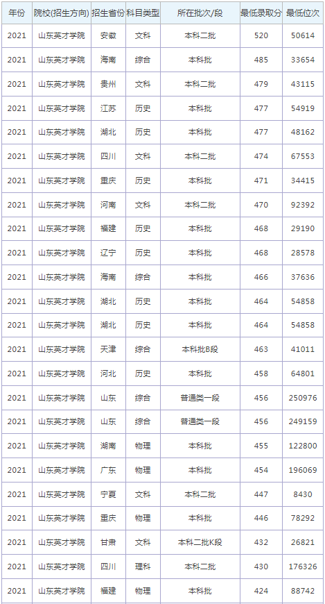 想要報(bào)考山東英才學(xué)院的同學(xué),都比較關(guān)注山東英才學(xué)院2022年的錄取分?jǐn)?shù)線,那么,高考多少分可以上山東英才學(xué)院呢?山東英才學(xué)院歷年最低錄取分?jǐn)?shù)線是多少?下面為大家整理了山東英才學(xué)院錄取分?jǐn)?shù)線2022是多少分(含2021-2022歷年),希望對(duì)大家有所幫助,僅供參考。![]() 山東英才學(xué)院錄取分?jǐn)?shù)線2022是多少分? 截止到目前,山東英才學(xué)院2022年錄取分?jǐn)?shù)線還未公布,如果需要2022年山東英才學(xué)院分?jǐn)?shù)線的同學(xué),不妨參考2021年山東英才學(xué)院錄取分?jǐn)?shù)線和山東英才學(xué)院歷年錄取分?jǐn)?shù)線,希望對(duì)大家有所幫助,如有不同,請(qǐng)以山東英才學(xué)院官網(wǎng)最新公布的信息為準(zhǔn)。 2021山東英才學(xué)院錄取分?jǐn)?shù)線 ![]() ![]() 山東英才學(xué)院是985還是211大學(xué)? 根據(jù)全國(guó)985和211大學(xué)名單可知:山東英才學(xué)院不是985大學(xué),也不是211大學(xué)。 ![]() 山東英才學(xué)院簡(jiǎn)介 山東英才學(xué)院(Shandong Yingcai University)坐落在山東省濟(jì)南市 ,是經(jīng)國(guó)家教育部批準(zhǔn)成立的民辦普通本科高等院校,入選百校工程。 學(xué)校創(chuàng)建于1998年6月,先后經(jīng)歷山東英才專(zhuān)修學(xué)院、山東英才職業(yè)技術(shù)學(xué)院、山東英才學(xué)院等階段,2008年,經(jīng)教育部批準(zhǔn),學(xué)校升格為普通本科高校。2017年,學(xué)校成為省級(jí)碩士培育建設(shè)單位。 通過(guò)對(duì)山東英才學(xué)院錄取分?jǐn)?shù)線的了解,大家大概知道了高考多少分可以上山東英才學(xué)院,以上數(shù)據(jù)源于網(wǎng)絡(luò),僅供參考,大家如果想要了解其他大學(xué)錄取分?jǐn)?shù)線、大學(xué)簡(jiǎn)介、大學(xué)排行榜、專(zhuān)業(yè)選擇等內(nèi)容,請(qǐng)點(diǎn)擊訪問(wèn):大學(xué)欄目。 推薦閱讀: 北京大學(xué)錄取分?jǐn)?shù)線 清華大學(xué)錄取分?jǐn)?shù)線 中國(guó)科學(xué)技術(shù)大學(xué)錄取分?jǐn)?shù)線 復(fù)旦大學(xué)錄取分?jǐn)?shù)線 南開(kāi)大學(xué)錄取分?jǐn)?shù)線 同濟(jì)大學(xué)錄取分?jǐn)?shù)線 |