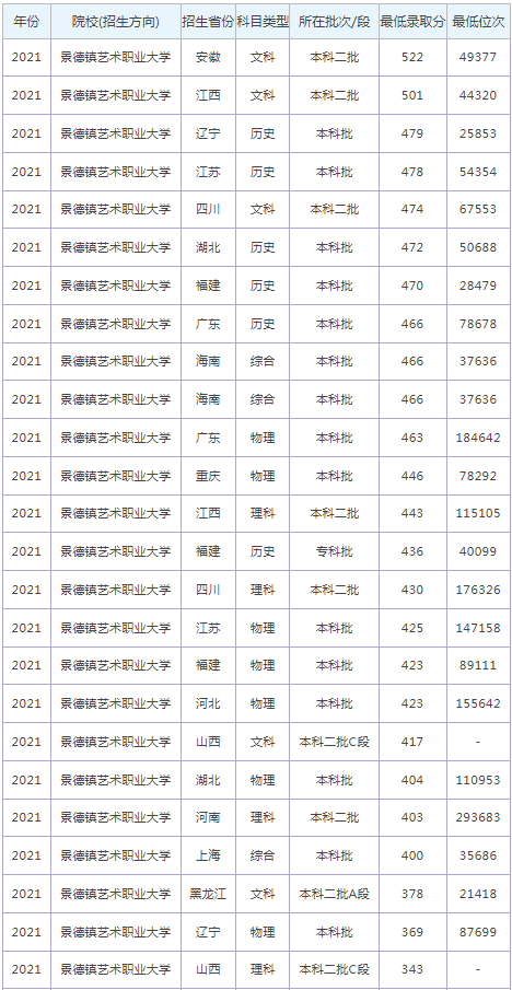 想要報考景德鎮(zhèn)藝術職業(yè)大學的同學,都比較關注景德鎮(zhèn)藝術職業(yè)大學2022年的錄取分數線,那么,高考多少分可以上景德鎮(zhèn)藝術職業(yè)大學呢?鄭州升達經貿管理學院歷年最低 錄取分數線是多少?下面為大家整理了景德鎮(zhèn)藝術職業(yè)大學錄取分數線2022是多少分(含2021-2022歷年),希望對大家有所幫助,僅供參考。![]() 景德鎮(zhèn)藝術職業(yè)大學錄取分數線2022是多少分? 截止到目前,景德鎮(zhèn)藝術職業(yè)大學2022年錄取分數線還未公布,如果需要2022年景德鎮(zhèn)藝術職業(yè)大學分數線的同學,不妨參考 2021年景德鎮(zhèn)藝術職業(yè)大學錄取分數線和景德鎮(zhèn)藝術職業(yè)大學歷年錄取分數線,希望對大家有所幫助,如有不同,請以鄭州升達經貿管理學院官網最新公布的信息為準。 2021景德鎮(zhèn)藝術職業(yè)大學錄取分數線 ![]() ![]() 景德鎮(zhèn)藝術職業(yè)大學是985還是211大學? 根據全國985和211大學名單可知:景德鎮(zhèn)藝術職業(yè)大學既不是985大學,也不是211大學。 ![]() 景德鎮(zhèn)藝術職業(yè)大學簡介 景德鎮(zhèn)藝術職業(yè)大學(Jingdezhen Ceramic Institute College of Technology and Art),是一所由原景德鎮(zhèn)陶瓷大學科技藝術學院轉設而來的本科層次職業(yè)院校。 經江西省發(fā)展計劃委員會、江西省教育廳批準成立、教育部備案的一所全日制本科層次民辦職業(yè)高等學校 ,是景德鎮(zhèn)市屬國有企業(yè)(景德鎮(zhèn)陶瓷文化旅游集團)舉辦的非營利性職業(yè)本科大學。 學校坐落在全國歷史文化名城、中國優(yōu)秀旅游城市、世界瓷都——江西省景德鎮(zhèn)市。學校規(guī)劃設計落實“保山空地、大疏大密、順勢創(chuàng)新、共享混合”的理念,是一所依山傍水,綠樹成蔭,花香四溢的花園式高校,是同學們求知求真、創(chuàng)新創(chuàng)業(yè)的勝地。 通過對景德鎮(zhèn)藝術職業(yè)大學錄取分數線的了解,大家大概知道了高考多少分可以上景德鎮(zhèn)藝術職業(yè)大學,以上數據源于網絡,僅供參考,大家如果想要了解其他大學錄取 分數線、大學簡介、大學排行榜、專業(yè)選擇等內容,請點擊訪問:大學欄目。 推薦閱讀: 西安交通大學錄取分數線 浙江大學錄取分數線 中國農業(yè)大學錄取分數線 哈爾濱工業(yè)大學錄取分數線 北京師范大學錄取分數線 中央民族大學錄取分數線 |
