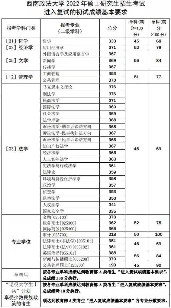 相信2023年考研的同學(xué)很多都十分關(guān)注,2023西南政法大學(xué)考研分?jǐn)?shù)線,那么,2023年西南政法大學(xué)研究生分?jǐn)?shù)線是多少呢?為了給大家提供方便,特整理了2023年西南政法大學(xué)研究生分?jǐn)?shù)線(含2022-2023年),希望可以幫助到大家。![]() 2023年西南政法大學(xué)研究生分?jǐn)?shù)線 國(guó)家教育部對(duì)2023年碩士研究生招生考試考生進(jìn)入復(fù)試的初試成績(jī)基本要求(A類考生)如下:(以下簡(jiǎn)稱“進(jìn)入復(fù)試成績(jī)基本要求”) ![]() 根據(jù)教育部2023年劃定的研究生“進(jìn)入復(fù)試成績(jī)基本要求”,以及我校各學(xué)科專業(yè)的生源上線情況,經(jīng)學(xué)校研究生招生工作領(lǐng)導(dǎo)小組研究確定我校進(jìn)入復(fù)試的初試成績(jī)基本要求(以下簡(jiǎn)稱學(xué)校復(fù)試線)如下: ![]() ![]() 2022年西南政法大學(xué)研究生分?jǐn)?shù)線一覽表 國(guó)家教育部對(duì)2022年碩士研究生招生考試考生進(jìn)入復(fù)試的初試成績(jī)基本要求(A類考生)如下:(以下簡(jiǎn)稱“進(jìn)入復(fù)試成績(jī)基本要求”) ![]() 根據(jù)教育部2022年劃定的研究生“進(jìn)入復(fù)試成績(jī)基本要求”,以及我校各學(xué)科專業(yè)的生源上線情況,經(jīng)學(xué)校研究生招生工作領(lǐng)導(dǎo)小組研究確定我校進(jìn)入復(fù)試的初試成績(jī)基本要求(以下簡(jiǎn)稱學(xué)校復(fù)試線)如下: ![]() 學(xué)校嚴(yán)格執(zhí)行教育部2022年全國(guó)研究生招生考試初試總分加分政策: 1.參加“大學(xué)生志愿服務(wù)西部計(jì)劃”“三支一扶計(jì)劃”“農(nóng)村義務(wù)教育階段學(xué)校教師特設(shè)崗位計(jì)劃”“赴外漢語(yǔ)教師志愿者”等項(xiàng)目服務(wù)期滿、考核合格的考生,3年內(nèi)參加全國(guó)碩士研究生招生考試的,初試總分加10分,同等條件下優(yōu)先錄取。 2.高校學(xué)生應(yīng)征入伍服現(xiàn)役退役,達(dá)到報(bào)考條件后,3年內(nèi)參加全國(guó)碩士研究生招生考試的考生,初試總分加10分,同等條件下優(yōu)先錄取。納入“退役大學(xué)生士兵”專項(xiàng)計(jì)劃招錄的,不再享受退役大學(xué)生士兵初試加分政策。在部隊(duì)榮立二等功以上,符合全國(guó)碩士研究生招生考試報(bào)考條件的,可申請(qǐng)免試(初試)攻讀碩士研究生。 3.參加“選聘高校畢業(yè)生到村任職”項(xiàng)目服務(wù)期滿、考核稱職以上的考生,3年內(nèi)參加全國(guó)碩士研究生招生考試的,初試總分加10分,同等條件下優(yōu)先錄取,其中報(bào)考人文社科類專業(yè)研究生的,初試總分加15分。 4.加分項(xiàng)目不累計(jì),同時(shí)滿足兩項(xiàng)以上加分條件的考生按最高項(xiàng)加分。 5.享受少數(shù)民族照顧政策考生,工作單位和戶籍在國(guó)務(wù)院公布的民族區(qū)域自治地方,且定向就業(yè)單位為原單位的少數(shù)民族在職人員考生,須達(dá)到教育部A類考生“進(jìn)入復(fù)試成績(jī)基本要求”各專業(yè)分?jǐn)?shù)要求。符合條件要求的考生須提交戶口薄(含戶口簿首頁(yè)及本人頁(yè))、考生所在工作單位同意考生定向培養(yǎng)的證明原件(加蓋所在單位人事部門公章)。 2022年考研國(guó)家復(fù)試線 ![]() ![]() 《2023年西南政法大學(xué)研究生分?jǐn)?shù)線一覽表》就為大家介紹到這里,如果想要了解歷年考研分?jǐn)?shù)線、國(guó)家線、考研復(fù)試分?jǐn)?shù)線、最新考研時(shí)間、考研復(fù)習(xí)技巧等內(nèi)容,請(qǐng)點(diǎn)擊訪問(wèn):考研欄目。 |