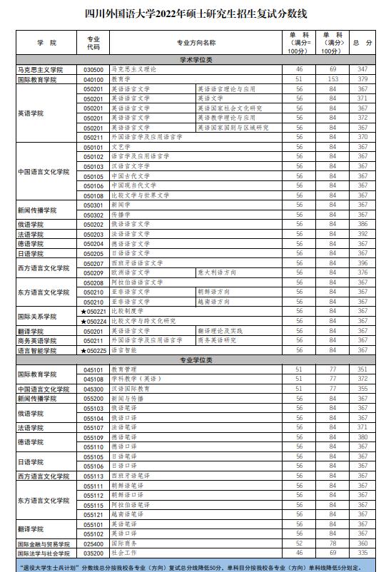 相信2023年考研的同學(xué)很多都十分關(guān)注,2023四川外國(guó)語(yǔ)大學(xué)考研分?jǐn)?shù)線,那么,2023年四川外國(guó)語(yǔ)大學(xué)研究生分?jǐn)?shù)線是多少呢?為了給大家提供方便,特整理了2023年四川外國(guó)語(yǔ)大學(xué)研究生分?jǐn)?shù)線(含2022-2023年),希望可以幫助到大家。![]() 2023年四川外國(guó)語(yǔ)大學(xué)研究生分?jǐn)?shù)線 ![]() 2022年四川外國(guó)語(yǔ)大學(xué)研究生分?jǐn)?shù)線一覽表 根據(jù)教育部《2022年全國(guó)碩士研究生招生考試考生進(jìn)入復(fù)試的初試成績(jī)基本要求》,結(jié)合我校各專業(yè)(方向)的生源上線情況,經(jīng)學(xué)校研究生招生工作領(lǐng)導(dǎo)小組研究,確定我校各專業(yè)(方向)復(fù)試分?jǐn)?shù)線(復(fù)試名單由各招生學(xué)院公布)?,F(xiàn)公告如下: ![]() 2022年考研國(guó)家復(fù)試線 ![]() ![]() 《2023年四川外國(guó)語(yǔ)大學(xué)研究生分?jǐn)?shù)線一覽表》就為大家介紹到這里,如果想要了解歷年考研分?jǐn)?shù)線、國(guó)家線、考研復(fù)試分?jǐn)?shù)線、最新考研時(shí)間、考研復(fù)習(xí)技巧等內(nèi)容,請(qǐng)點(diǎn)擊訪問(wèn):考研欄目。 |